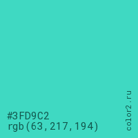 Цвет #3FD9C2 в цветовой модели RGB обозначается тремя октетами (63, 217, 194) в десятичном формате и #3FD9C2 в шестнадцатиричном (hex) формате, которые являются интенсивностью красного 63 (hex 3F), интенсивность зелёного 217 (hex D9) и интенсивность синего 194 (hex C2).