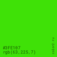 Цвет #3FE107 в цветовой модели RGB обозначается тремя октетами (63, 225, 7) в десятичном формате и #3FE107 в шестнадцатиричном (hex) формате, которые являются интенсивностью красного 63 (hex 3F), интенсивность зелёного 225 (hex E1) и интенсивность синего 7 (hex 07).