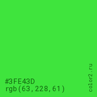 Цвет #3FE43D в цветовой модели RGB обозначается тремя октетами (63, 228, 61) в десятичном формате и #3FE43D в шестнадцатиричном (hex) формате, которые являются интенсивностью красного 63 (hex 3F), интенсивность зелёного 228 (hex E4) и интенсивность синего 61 (hex 3D).