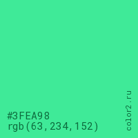 Цвет #3FEA98 в цветовой модели RGB обозначается тремя октетами (63, 234, 152) в десятичном формате и #3FEA98 в шестнадцатиричном (hex) формате, которые являются интенсивностью красного 63 (hex 3F), интенсивность зелёного 234 (hex EA) и интенсивность синего 152 (hex 98).