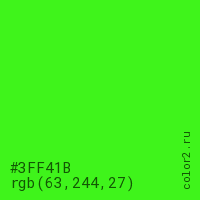 Цвет #3FF41B в цветовой модели RGB обозначается тремя октетами (63, 244, 27) в десятичном формате и #3FF41B в шестнадцатиричном (hex) формате, которые являются интенсивностью красного 63 (hex 3F), интенсивность зелёного 244 (hex F4) и интенсивность синего 27 (hex 1B).