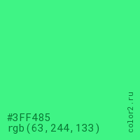 Цвет #3FF485 в цветовой модели RGB обозначается тремя октетами (63, 244, 133) в десятичном формате и #3FF485 в шестнадцатиричном (hex) формате, которые являются интенсивностью красного 63 (hex 3F), интенсивность зелёного 244 (hex F4) и интенсивность синего 133 (hex 85).