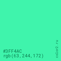 Цвет #3FF4AC в цветовой модели RGB обозначается тремя октетами (63, 244, 172) в десятичном формате и #3FF4AC в шестнадцатиричном (hex) формате, которые являются интенсивностью красного 63 (hex 3F), интенсивность зелёного 244 (hex F4) и интенсивность синего 172 (hex AC).