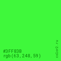 Цвет #3FF83B в цветовой модели RGB обозначается тремя октетами (63, 248, 59) в десятичном формате и #3FF83B в шестнадцатиричном (hex) формате, которые являются интенсивностью красного 63 (hex 3F), интенсивность зелёного 248 (hex F8) и интенсивность синего 59 (hex 3B).