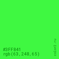 Цвет #3FF841 в цветовой модели RGB обозначается тремя октетами (63, 248, 65) в десятичном формате и #3FF841 в шестнадцатиричном (hex) формате, которые являются интенсивностью красного 63 (hex 3F), интенсивность зелёного 248 (hex F8) и интенсивность синего 65 (hex 41).
