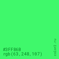 Цвет #3FF86B в цветовой модели RGB обозначается тремя октетами (63, 248, 107) в десятичном формате и #3FF86B в шестнадцатиричном (hex) формате, которые являются интенсивностью красного 63 (hex 3F), интенсивность зелёного 248 (hex F8) и интенсивность синего 107 (hex 6B).