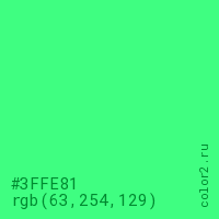 Цвет #3FFE81 в цветовой модели RGB обозначается тремя октетами (63, 254, 129) в десятичном формате и #3FFE81 в шестнадцатиричном (hex) формате, которые являются интенсивностью красного 63 (hex 3F), интенсивность зелёного 254 (hex FE) и интенсивность синего 129 (hex 81).