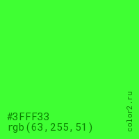 Цвет #3FFF33 в цветовой модели RGB обозначается тремя октетами (63, 255, 51) в десятичном формате и #3FFF33 в шестнадцатиричном (hex) формате, которые являются интенсивностью красного 63 (hex 3F), интенсивность зелёного 255 (hex FF) и интенсивность синего 51 (hex 33).