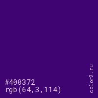 Цвет #400372 в цветовой модели RGB обозначается тремя октетами (64, 3, 114) в десятичном формате и #400372 в шестнадцатиричном (hex) формате, которые являются интенсивностью красного 64 (hex 40), интенсивность зелёного 3 (hex 03) и интенсивность синего 114 (hex 72).