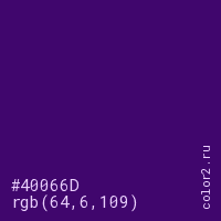 Цвет #40066D в цветовой модели RGB обозначается тремя октетами (64, 6, 109) в десятичном формате и #40066D в шестнадцатиричном (hex) формате, которые являются интенсивностью красного 64 (hex 40), интенсивность зелёного 6 (hex 06) и интенсивность синего 109 (hex 6D).