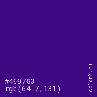 Цвет #400783 в цветовой модели RGB обозначается тремя октетами (64, 7, 131) в десятичном формате и #400783 в шестнадцатиричном (hex) формате, которые являются интенсивностью красного 64 (hex 40), интенсивность зелёного 7 (hex 07) и интенсивность синего 131 (hex 83).
