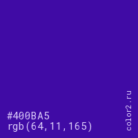 Цвет #400BA5 в цветовой модели RGB обозначается тремя октетами (64, 11, 165) в десятичном формате и #400BA5 в шестнадцатиричном (hex) формате, которые являются интенсивностью красного 64 (hex 40), интенсивность зелёного 11 (hex 0B) и интенсивность синего 165 (hex A5).