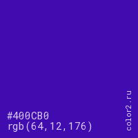 Цвет #400CB0 в цветовой модели RGB обозначается тремя октетами (64, 12, 176) в десятичном формате и #400CB0 в шестнадцатиричном (hex) формате, которые являются интенсивностью красного 64 (hex 40), интенсивность зелёного 12 (hex 0C) и интенсивность синего 176 (hex B0).