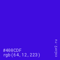 Цвет #400CDF в цветовой модели RGB обозначается тремя октетами (64, 12, 223) в десятичном формате и #400CDF в шестнадцатиричном (hex) формате, которые являются интенсивностью красного 64 (hex 40), интенсивность зелёного 12 (hex 0C) и интенсивность синего 223 (hex DF).