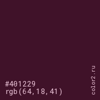 Цвет #401229 в цветовой модели RGB обозначается тремя октетами (64, 18, 41) в десятичном формате и #401229 в шестнадцатиричном (hex) формате, которые являются интенсивностью красного 64 (hex 40), интенсивность зелёного 18 (hex 12) и интенсивность синего 41 (hex 29).