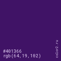 Цвет #401366 в цветовой модели RGB обозначается тремя октетами (64, 19, 102) в десятичном формате и #401366 в шестнадцатиричном (hex) формате, которые являются интенсивностью красного 64 (hex 40), интенсивность зелёного 19 (hex 13) и интенсивность синего 102 (hex 66).