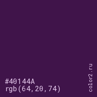 Цвет #40144A в цветовой модели RGB обозначается тремя октетами (64, 20, 74) в десятичном формате и #40144A в шестнадцатиричном (hex) формате, которые являются интенсивностью красного 64 (hex 40), интенсивность зелёного 20 (hex 14) и интенсивность синего 74 (hex 4A).