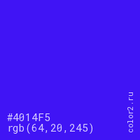 Цвет #4014F5 в цветовой модели RGB обозначается тремя октетами (64, 20, 245) в десятичном формате и #4014F5 в шестнадцатиричном (hex) формате, которые являются интенсивностью красного 64 (hex 40), интенсивность зелёного 20 (hex 14) и интенсивность синего 245 (hex F5).
