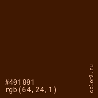 Цвет #401801 в цветовой модели RGB обозначается тремя октетами (64, 24, 1) в десятичном формате и #401801 в шестнадцатиричном (hex) формате, которые являются интенсивностью красного 64 (hex 40), интенсивность зелёного 24 (hex 18) и интенсивность синего 1 (hex 01).