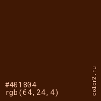 Цвет #401804 в цветовой модели RGB обозначается тремя октетами (64, 24, 4) в десятичном формате и #401804 в шестнадцатиричном (hex) формате, которые являются интенсивностью красного 64 (hex 40), интенсивность зелёного 24 (hex 18) и интенсивность синего 4 (hex 04).