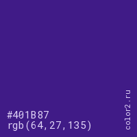 Цвет #401B87 в цветовой модели RGB обозначается тремя октетами (64, 27, 135) в десятичном формате и #401B87 в шестнадцатиричном (hex) формате, которые являются интенсивностью красного 64 (hex 40), интенсивность зелёного 27 (hex 1B) и интенсивность синего 135 (hex 87).