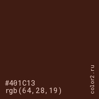 Цвет #401C13 в цветовой модели RGB обозначается тремя октетами (64, 28, 19) в десятичном формате и #401C13 в шестнадцатиричном (hex) формате, которые являются интенсивностью красного 64 (hex 40), интенсивность зелёного 28 (hex 1C) и интенсивность синего 19 (hex 13).
