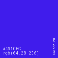 Цвет #401CEC в цветовой модели RGB обозначается тремя октетами (64, 28, 236) в десятичном формате и #401CEC в шестнадцатиричном (hex) формате, которые являются интенсивностью красного 64 (hex 40), интенсивность зелёного 28 (hex 1C) и интенсивность синего 236 (hex EC).