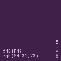 Цвет #401F49 в цветовой модели RGB обозначается тремя октетами (64, 31, 73) в десятичном формате и #401F49 в шестнадцатиричном (hex) формате, которые являются интенсивностью красного 64 (hex 40), интенсивность зелёного 31 (hex 1F) и интенсивность синего 73 (hex 49).