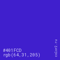 Цвет #401FCD в цветовой модели RGB обозначается тремя октетами (64, 31, 205) в десятичном формате и #401FCD в шестнадцатиричном (hex) формате, которые являются интенсивностью красного 64 (hex 40), интенсивность зелёного 31 (hex 1F) и интенсивность синего 205 (hex CD).