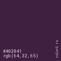 Цвет #402041 в цветовой модели RGB обозначается тремя октетами (64, 32, 65) в десятичном формате и #402041 в шестнадцатиричном (hex) формате, которые являются интенсивностью красного 64 (hex 40), интенсивность зелёного 32 (hex 20) и интенсивность синего 65 (hex 41).