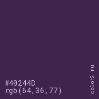 Цвет #40244D в цветовой модели RGB обозначается тремя октетами (64, 36, 77) в десятичном формате и #40244D в шестнадцатиричном (hex) формате, которые являются интенсивностью красного 64 (hex 40), интенсивность зелёного 36 (hex 24) и интенсивность синего 77 (hex 4D).