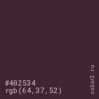 Цвет #402534 в цветовой модели RGB обозначается тремя октетами (64, 37, 52) в десятичном формате и #402534 в шестнадцатиричном (hex) формате, которые являются интенсивностью красного 64 (hex 40), интенсивность зелёного 37 (hex 25) и интенсивность синего 52 (hex 34).