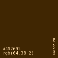 Цвет #402602 в цветовой модели RGB обозначается тремя октетами (64, 38, 2) в десятичном формате и #402602 в шестнадцатиричном (hex) формате, которые являются интенсивностью красного 64 (hex 40), интенсивность зелёного 38 (hex 26) и интенсивность синего 2 (hex 02).