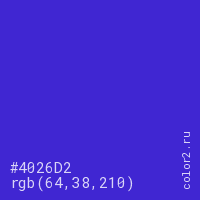 Цвет #4026D2 в цветовой модели RGB обозначается тремя октетами (64, 38, 210) в десятичном формате и #4026D2 в шестнадцатиричном (hex) формате, которые являются интенсивностью красного 64 (hex 40), интенсивность зелёного 38 (hex 26) и интенсивность синего 210 (hex D2).