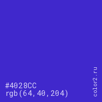 Цвет #4028CC в цветовой модели RGB обозначается тремя октетами (64, 40, 204) в десятичном формате и #4028CC в шестнадцатиричном (hex) формате, которые являются интенсивностью красного 64 (hex 40), интенсивность зелёного 40 (hex 28) и интенсивность синего 204 (hex CC).
