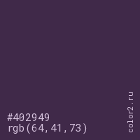 Цвет #402949 в цветовой модели RGB обозначается тремя октетами (64, 41, 73) в десятичном формате и #402949 в шестнадцатиричном (hex) формате, которые являются интенсивностью красного 64 (hex 40), интенсивность зелёного 41 (hex 29) и интенсивность синего 73 (hex 49).