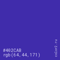 Цвет #402CAB в цветовой модели RGB обозначается тремя октетами (64, 44, 171) в десятичном формате и #402CAB в шестнадцатиричном (hex) формате, которые являются интенсивностью красного 64 (hex 40), интенсивность зелёного 44 (hex 2C) и интенсивность синего 171 (hex AB).