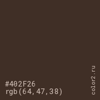 Цвет #402F26 в цветовой модели RGB обозначается тремя октетами (64, 47, 38) в десятичном формате и #402F26 в шестнадцатиричном (hex) формате, которые являются интенсивностью красного 64 (hex 40), интенсивность зелёного 47 (hex 2F) и интенсивность синего 38 (hex 26).