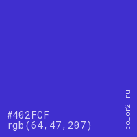 Цвет #402FCF в цветовой модели RGB обозначается тремя октетами (64, 47, 207) в десятичном формате и #402FCF в шестнадцатиричном (hex) формате, которые являются интенсивностью красного 64 (hex 40), интенсивность зелёного 47 (hex 2F) и интенсивность синего 207 (hex CF).