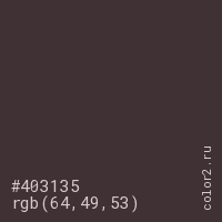 Цвет #403135 в цветовой модели RGB обозначается тремя октетами (64, 49, 53) в десятичном формате и #403135 в шестнадцатиричном (hex) формате, которые являются интенсивностью красного 64 (hex 40), интенсивность зелёного 49 (hex 31) и интенсивность синего 53 (hex 35).