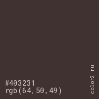 Цвет #403231 в цветовой модели RGB обозначается тремя октетами (64, 50, 49) в десятичном формате и #403231 в шестнадцатиричном (hex) формате, которые являются интенсивностью красного 64 (hex 40), интенсивность зелёного 50 (hex 32) и интенсивность синего 49 (hex 31).