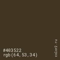 Цвет #403522 в цветовой модели RGB обозначается тремя октетами (64, 53, 34) в десятичном формате и #403522 в шестнадцатиричном (hex) формате, которые являются интенсивностью красного 64 (hex 40), интенсивность зелёного 53 (hex 35) и интенсивность синего 34 (hex 22).