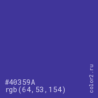 Цвет #40359A в цветовой модели RGB обозначается тремя октетами (64, 53, 154) в десятичном формате и #40359A в шестнадцатиричном (hex) формате, которые являются интенсивностью красного 64 (hex 40), интенсивность зелёного 53 (hex 35) и интенсивность синего 154 (hex 9A).