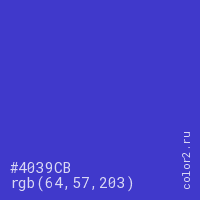 Цвет #4039CB в цветовой модели RGB обозначается тремя октетами (64, 57, 203) в десятичном формате и #4039CB в шестнадцатиричном (hex) формате, которые являются интенсивностью красного 64 (hex 40), интенсивность зелёного 57 (hex 39) и интенсивность синего 203 (hex CB).