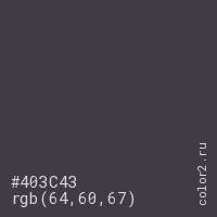 Цвет #403C43 в цветовой модели RGB обозначается тремя октетами (64, 60, 67) в десятичном формате и #403C43 в шестнадцатиричном (hex) формате, которые являются интенсивностью красного 64 (hex 40), интенсивность зелёного 60 (hex 3C) и интенсивность синего 67 (hex 43).