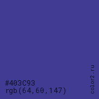 Цвет #403C93 в цветовой модели RGB обозначается тремя октетами (64, 60, 147) в десятичном формате и #403C93 в шестнадцатиричном (hex) формате, которые являются интенсивностью красного 64 (hex 40), интенсивность зелёного 60 (hex 3C) и интенсивность синего 147 (hex 93).