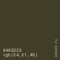Цвет #403D28 в цветовой модели RGB обозначается тремя октетами (64, 61, 40) в десятичном формате и #403D28 в шестнадцатиричном (hex) формате, которые являются интенсивностью красного 64 (hex 40), интенсивность зелёного 61 (hex 3D) и интенсивность синего 40 (hex 28).