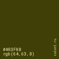 Цвет #403F08 в цветовой модели RGB обозначается тремя октетами (64, 63, 8) в десятичном формате и #403F08 в шестнадцатиричном (hex) формате, которые являются интенсивностью красного 64 (hex 40), интенсивность зелёного 63 (hex 3F) и интенсивность синего 8 (hex 08).