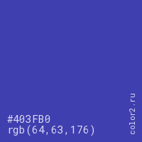 Цвет #403FB0 в цветовой модели RGB обозначается тремя октетами (64, 63, 176) в десятичном формате и #403FB0 в шестнадцатиричном (hex) формате, которые являются интенсивностью красного 64 (hex 40), интенсивность зелёного 63 (hex 3F) и интенсивность синего 176 (hex B0).