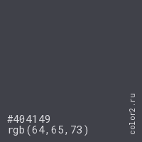 Цвет #404149 в цветовой модели RGB обозначается тремя октетами (64, 65, 73) в десятичном формате и #404149 в шестнадцатиричном (hex) формате, которые являются интенсивностью красного 64 (hex 40), интенсивность зелёного 65 (hex 41) и интенсивность синего 73 (hex 49).